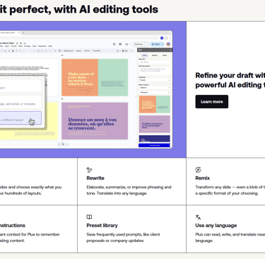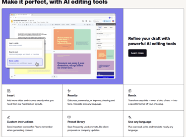 🏆 Choose Plus AI if you need to process a monthly analytics report, summarize a lengthy document into bullet points for your team, and you don't want to leave the safety of Google Slides.